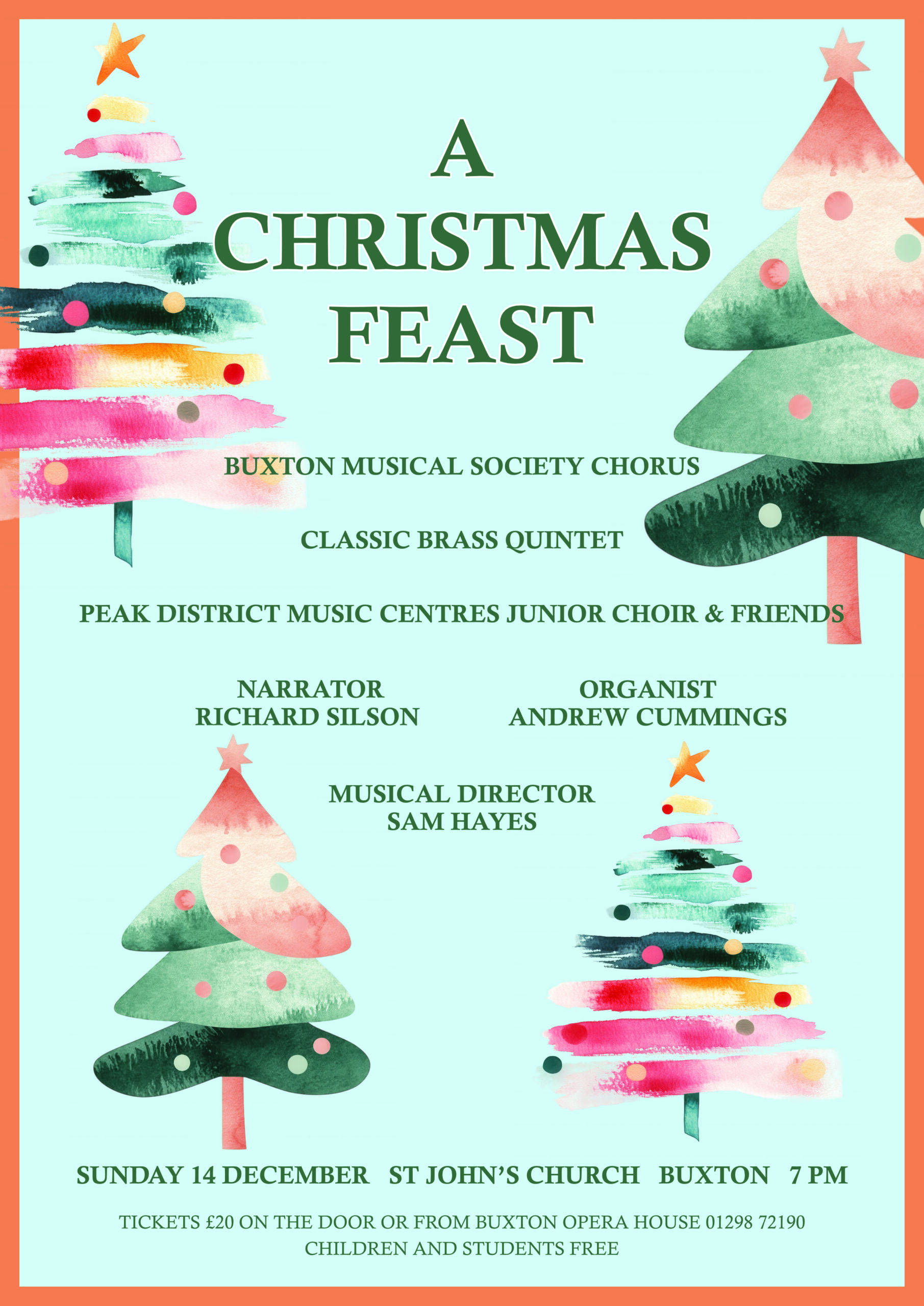 Tickets: £20.00 (unreserved) are available from Buxton Opera House Box Office 01298 72190 https://buxtonoperahouse.org.uk/events/a-christmas-feast-buxton-musical-society/ , or from Society members or on the door (limited availability). Accompanied children and full-time students are admitted free to Buxton Musical Society concerts.